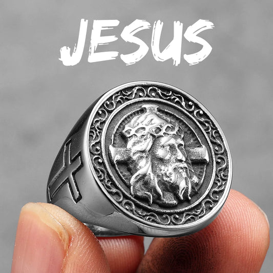 Anel Masculino Prateado Jesus em Aço Inoxidável 316L