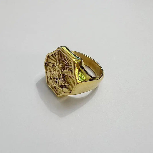Anel Masculino Octogonal Arcanjo São Miguel em Aço Inoxidável e Titânio