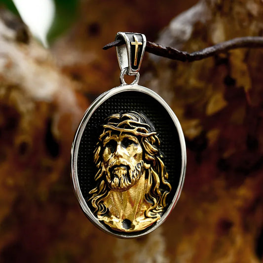 Pingente Masculino Oval Jesus Cristo em Aço Inoxidável – Prata e Dourado