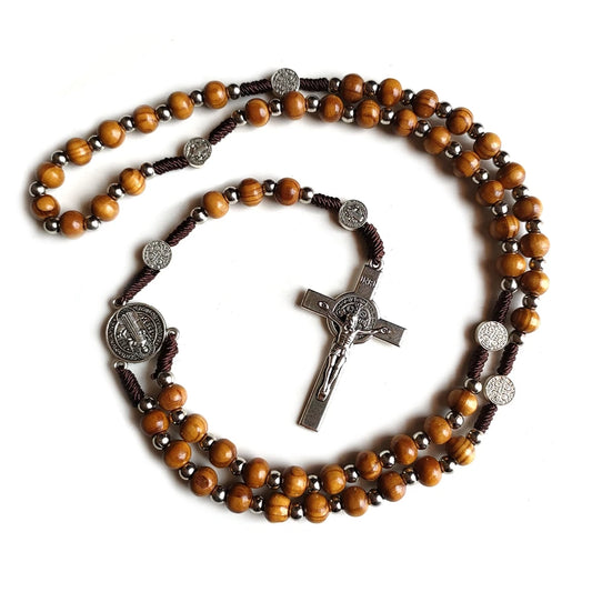 Terço com Medalha e Cruz de São Bento com Contas de Madeira