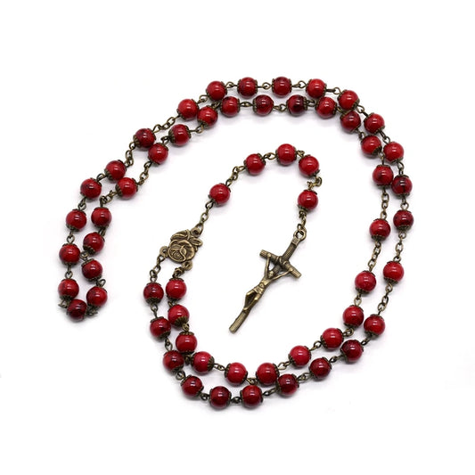 Terço de Nossa Senhora de Lourdes em Bronze com Contas de Vidro Vermelho