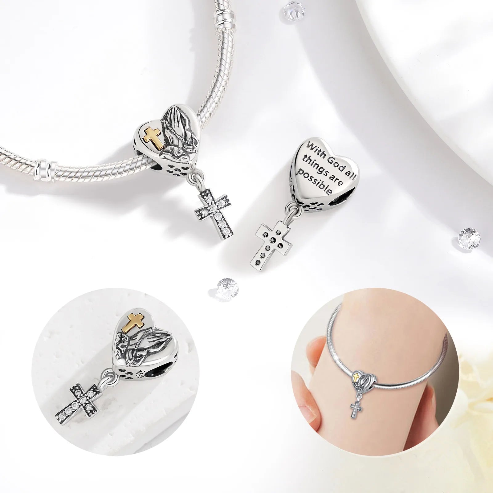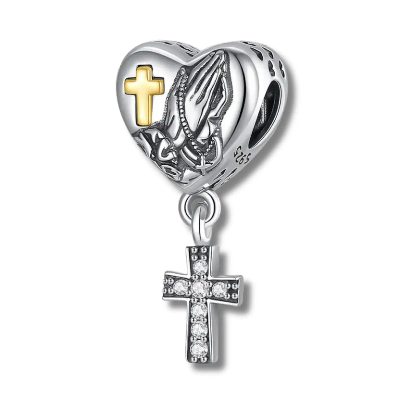 Escolha hoje o Berloque Cruz em Prata Esterlina 925 com Mãos em Oração e transforme seu acessório em um testemunho de devoção.