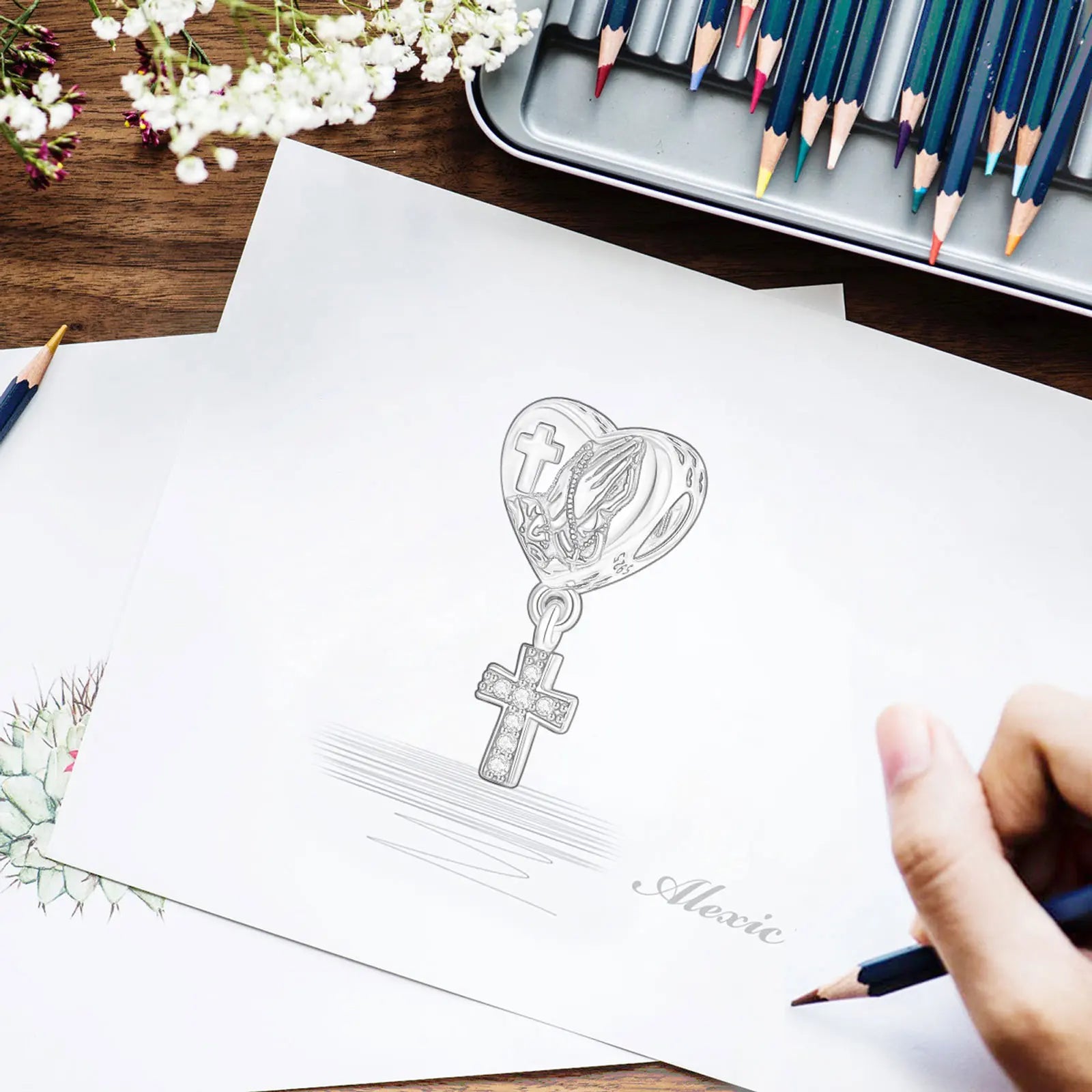 - Design cheio de fé: coração com mãos em oração e cruz em destaque.