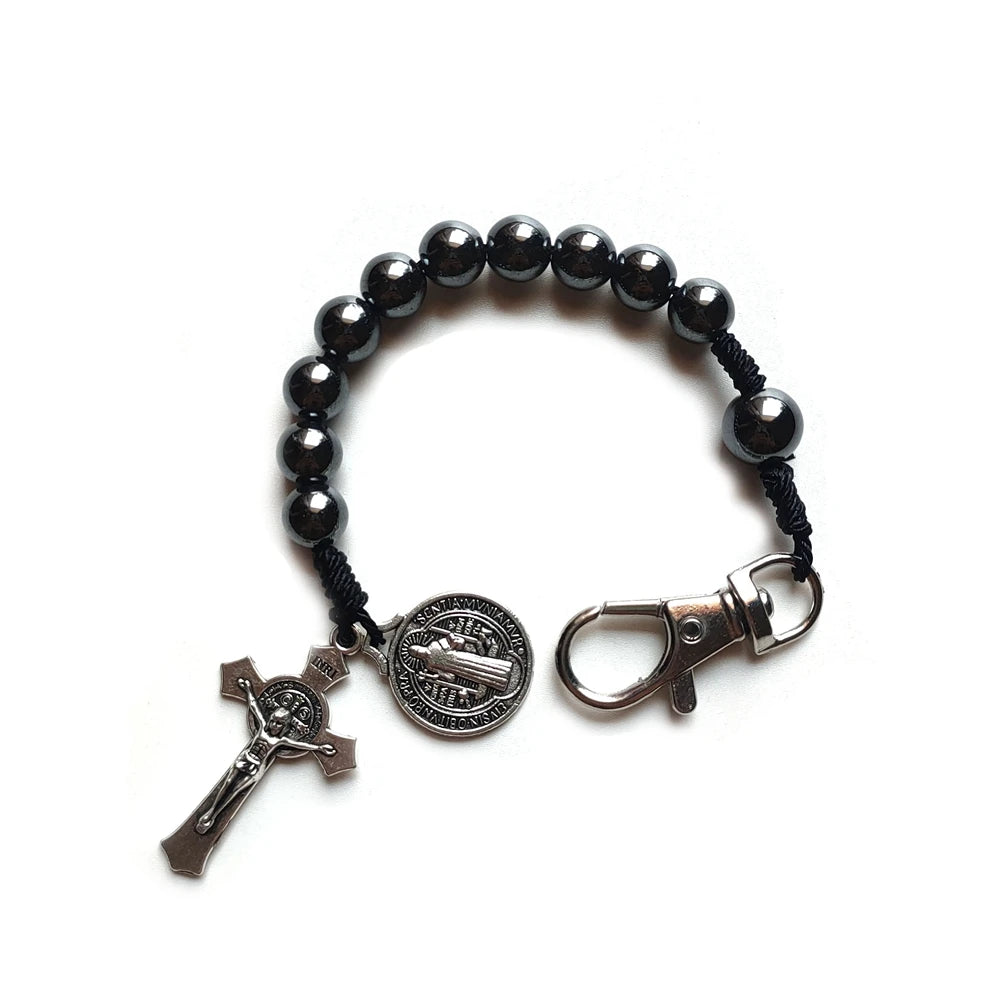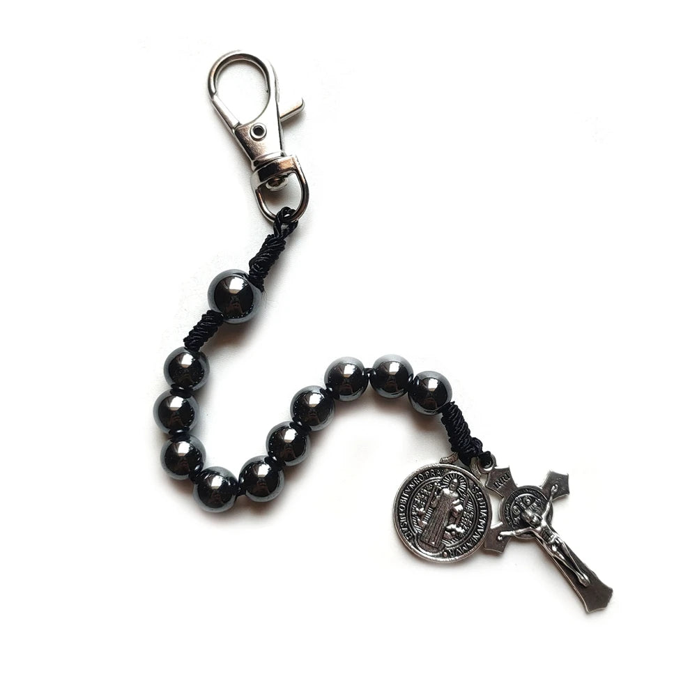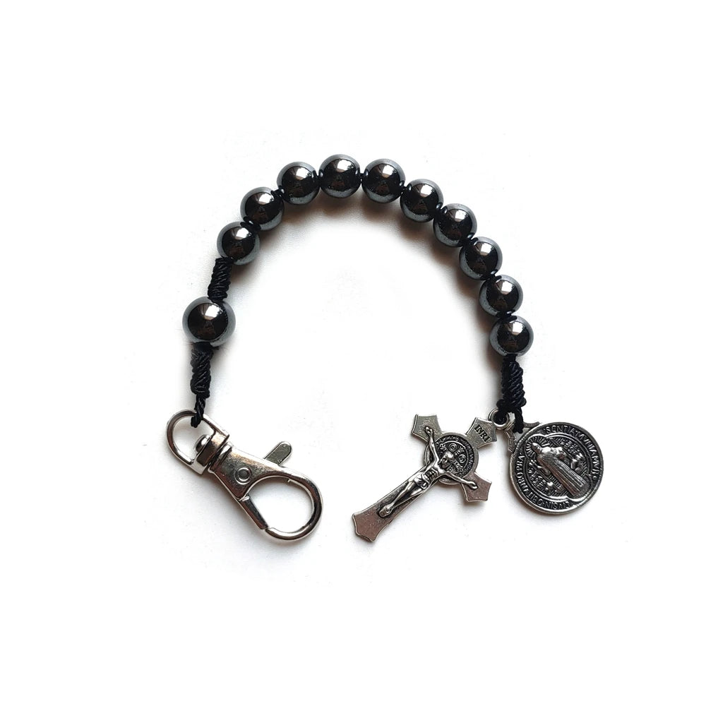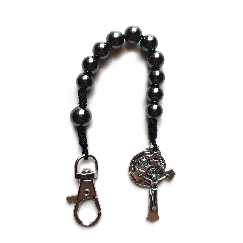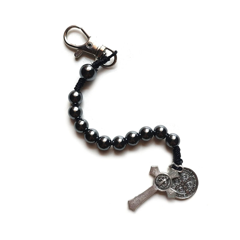 Chaveiro Dezena de Hematita com Cruz e Medalha de São Bento