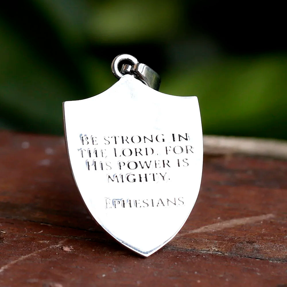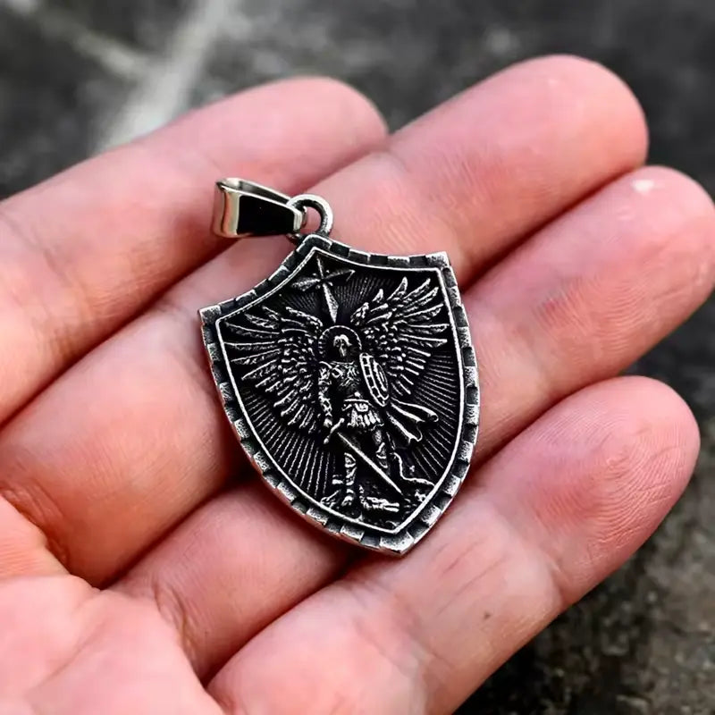 O pingente exibe a imagem de São Miguel em posição de combate, empunhando sua espada contra o mal. Um símbolo atemporal da luta espiritual e da proteção divina.