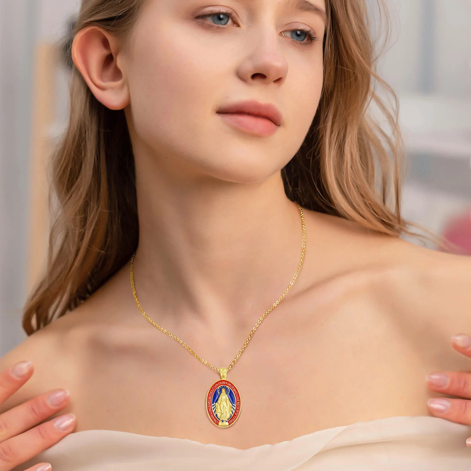 Inspirado na aparição de Nossa Senhora a Santa Catarina Labouré, em 1830, este colar traz consigo a oração inscrita na medalha: