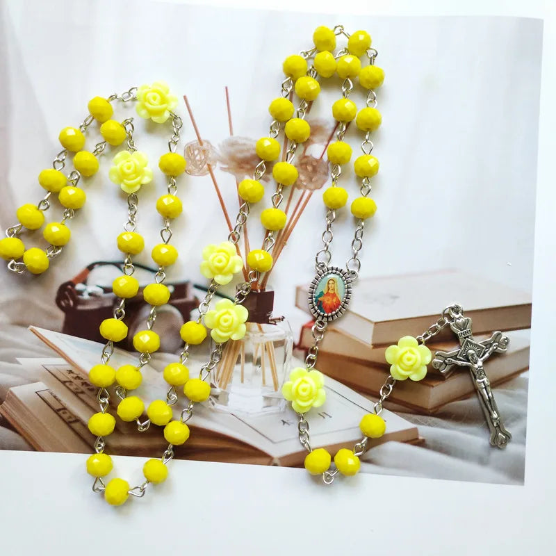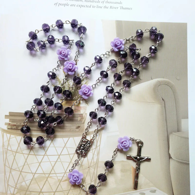 Colar Terço com Contas de Cristal e Rosas