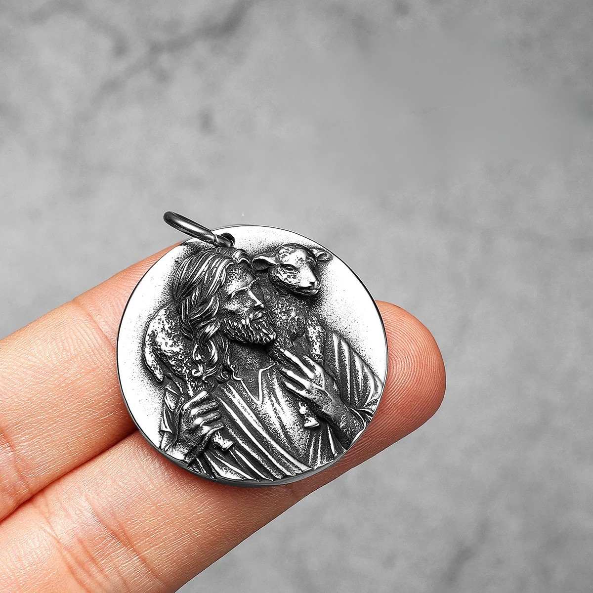 No pingente, Jesus é representado carregando a ovelha sobre os ombros — imagem do Bom Pastor que nunca abandona os seus.