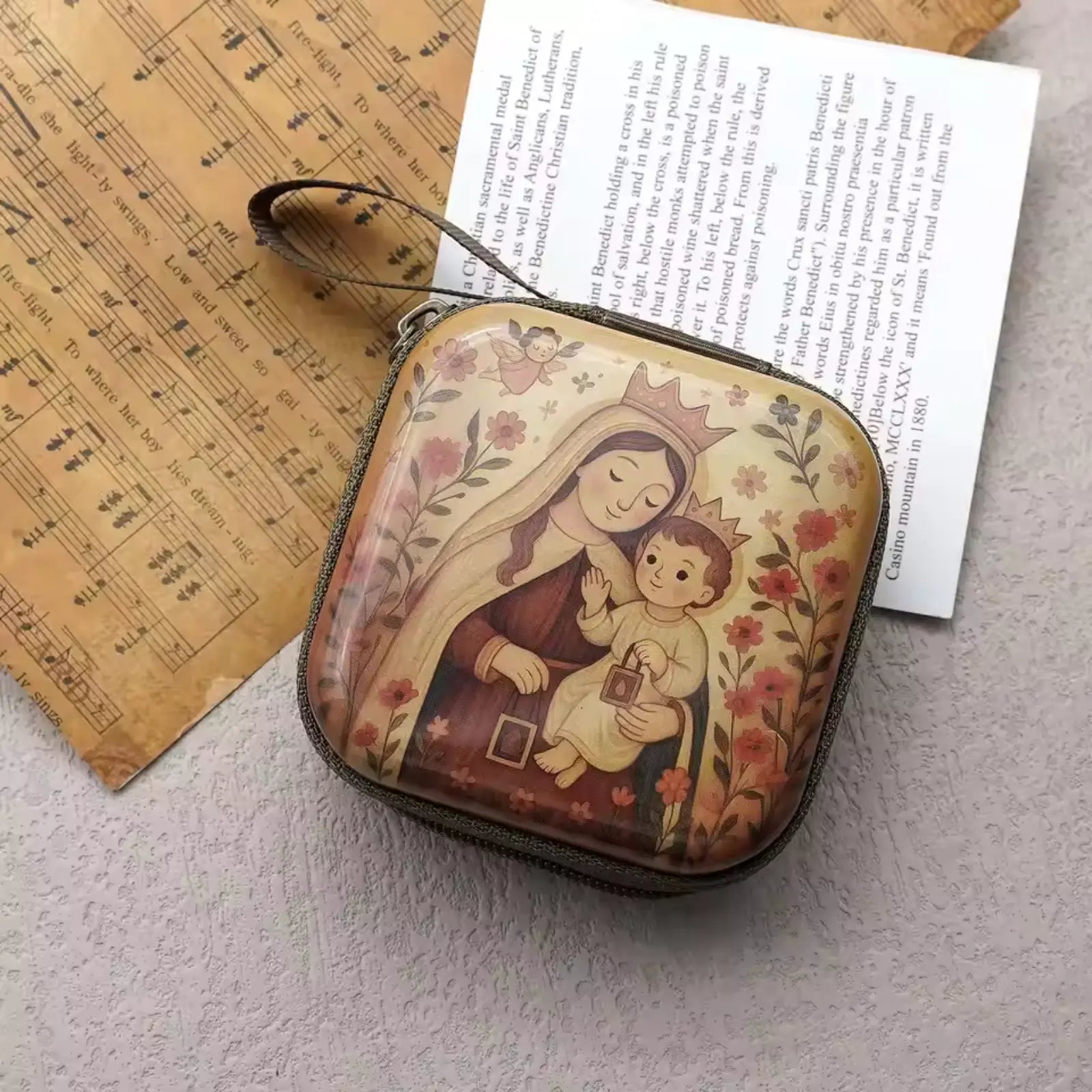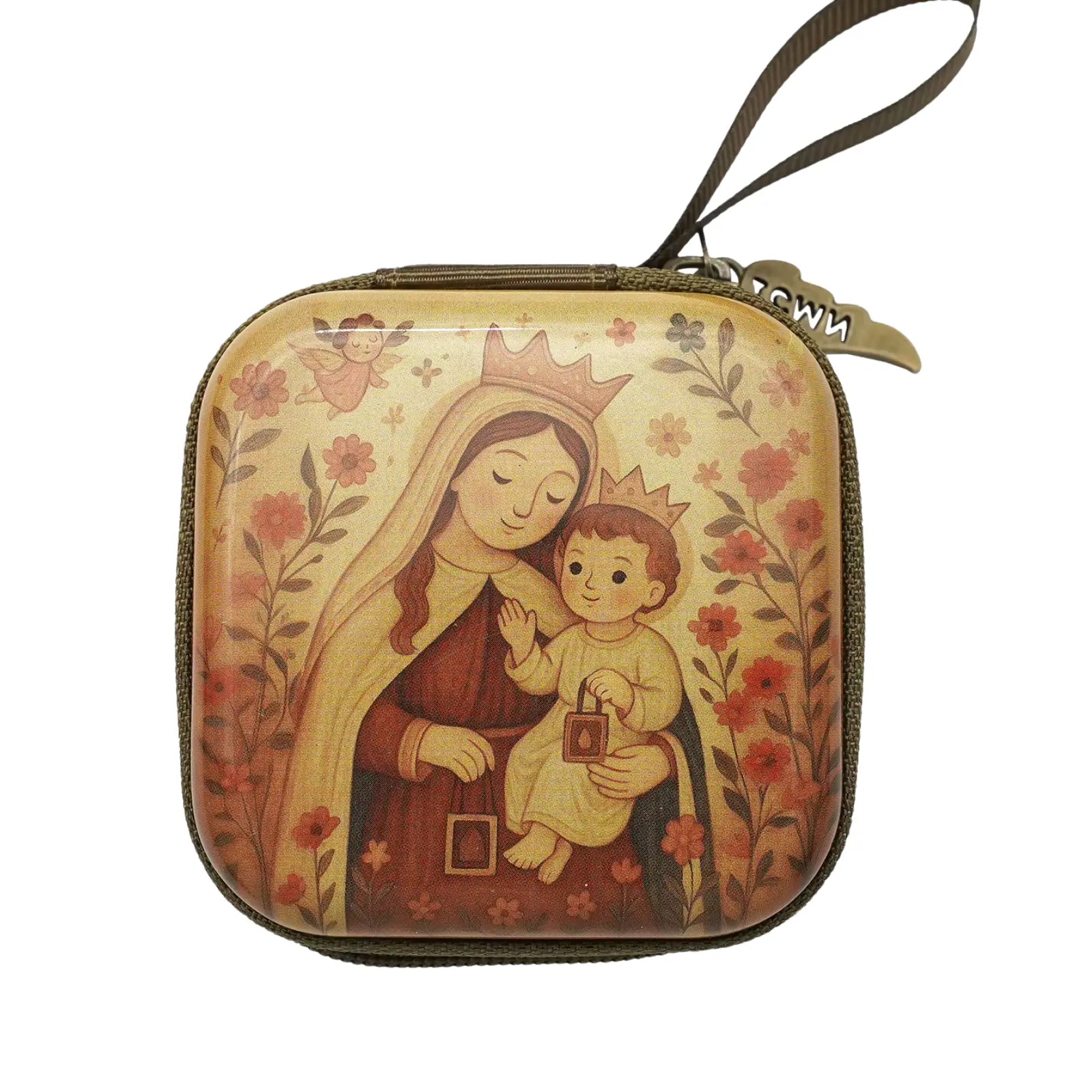 Compacto e resistente, este estojo preserva seu terço e traz a imagem em estilo cartoon da Mãe do Carmelo, lembrando que toda oração feita com confiança chega ao coração de Deus pelas mãos de Maria.