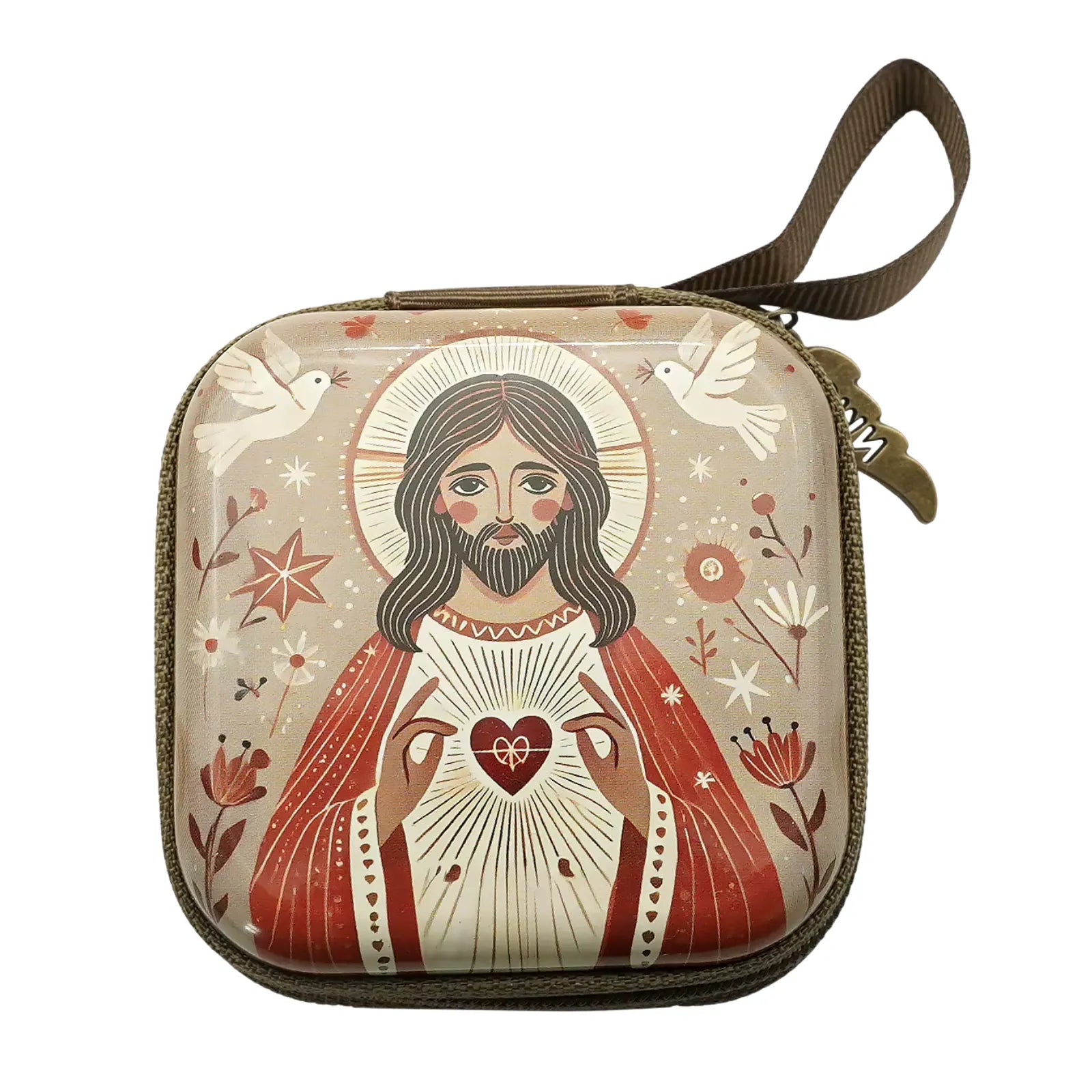 Com a imagem em estilo cartoon do Sagrado Coração, este estojo compacto protege seu terço e recorda, a cada uso, que Cristo prometeu consolar, fortalecer e abençoar aqueles que confiam em seu Coração.