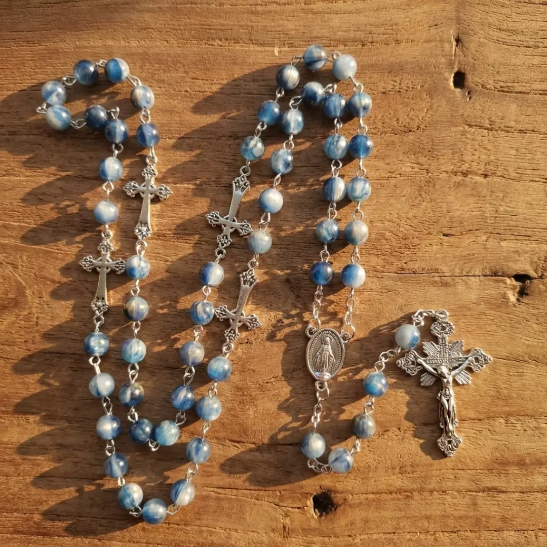 A cor azul, profundamente ligada à Virgem Maria na tradição da Igreja, remete à fidelidade, proteção e esperança. Seus materiais oferecem beleza e resistência, auxiliando o fiel a perseverar na oração e a manter a fé viva no dia a dia.