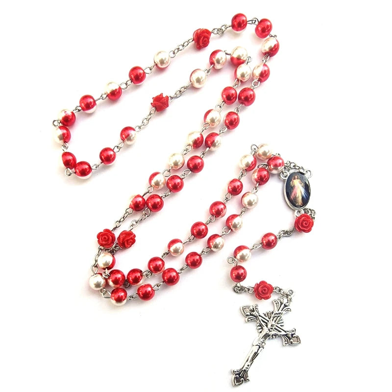 Com entremeio de Jesus Misericordioso, crucifixo prateado e contas em vidro branco e vermelho — que recordam os raios de sangue e água — cada detalhe carrega significado eterno.