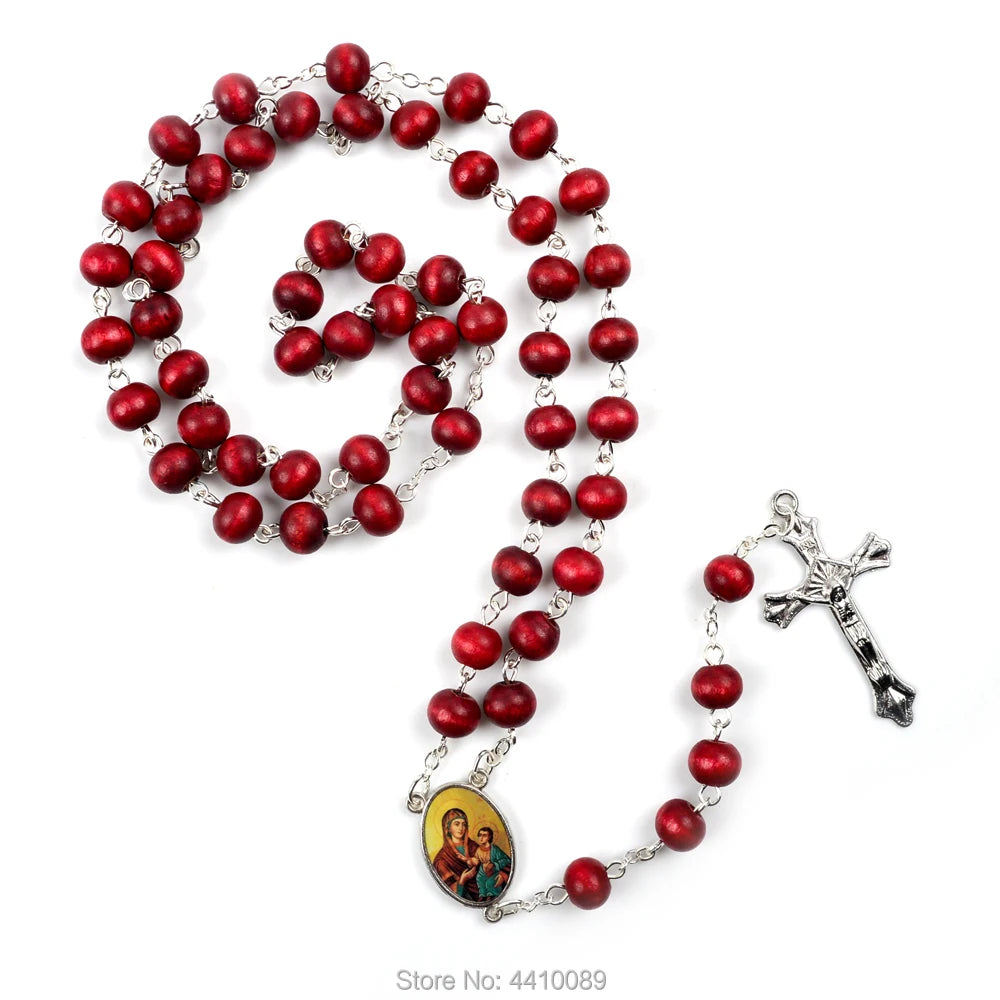 Com contas em madeira vermelha (7 x 8 mm), entremeio com a imagem de Nossa Senhora do Perpétuo Socorro e crucifixo prateado, este terço une simplicidade, resistência e devoção.